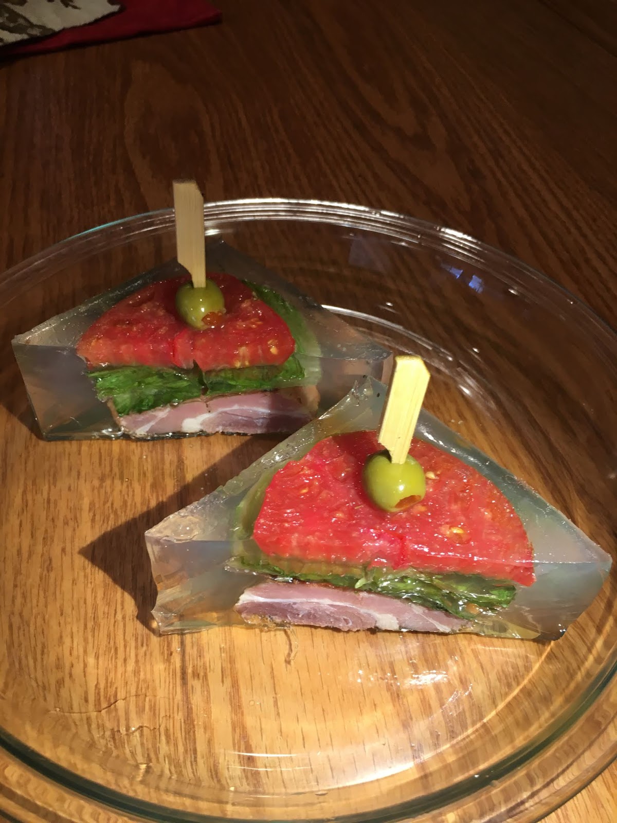 Sometimes the world is strange and surprising. I posted this BLT in a Martini yesterday and shared it a few places. The number of responses on my page has been extraordinary, and over 500 shares weirdly, but why 1200 likes as of now in an aspic group? Has the algorithm changed? Are people paying attention to the nonsense I post? And why are there such violent protests of love and hate? Why would someone take the time to say how disgusting they think this is? It's just cured pork belly (bacon) lettuce and tomato set in a gin and vermouth gelatin with a touch of sugar. How could this be offensive? What weird chord has this struck?? The next book must be pitched now. The New Age of Aspics. Cecelia Watson says she will write it with me!