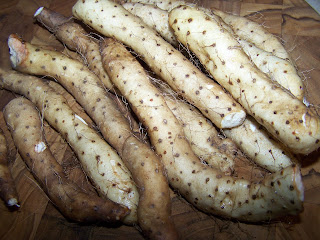 Dioscorea opposita, aka Chinese yam. a cousin of the true yam. Grated raw is wicked slimy and would indeed make a good sex lubricant. Fried in oil it makes one of the best latkes I've ever eaten. See. It's the base for okonomiyaki! Thanks to my old pal Brian and his wife! You win a recipe for okonomiyaki. Grate these like for latkes, mix in shredded cabbage, scallions, ginger, crushed peanuts and salt. Then fry like a big pancake. If you're not vegan add egg and raw shrimp finely chopped.