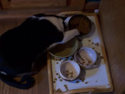 He actually scoops his food from the bowl. Messily, we admit, but usually lands it right into the water bowl. Leaves it there for about 10 seconds, decides that it's soaked enough, and deftly scoops it out with his paw and puts it daintily in his mouth.