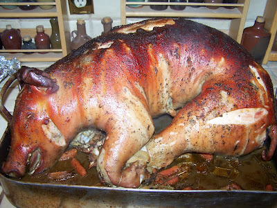 I marinated her in lime, chilies, onion, cilantro and cumin. And a beer. Then just popped her in the oven for about 4 hours. And the flavor was truly surprising. Delicate, light. More like turkey than any pork I've tasted. Good, unctuous and moist turkey. But definitely a white meat. The skin was crackly too, yummy crunchy ears, and I even got some tail.