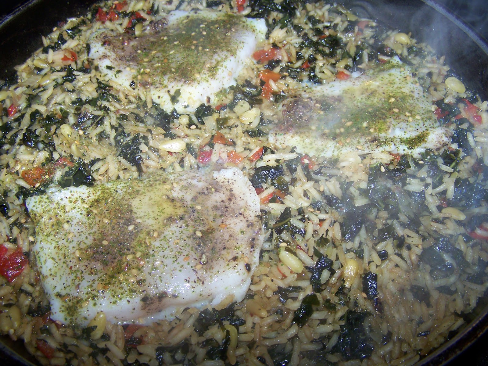 So what is it?? Simple: No particular name. You sautee some cavolo nero in oil, diced and minus the tough ribs, then add rice. Brown nicely. Then add fish stock. Pine nuts. Roasted red pepper. And some nice white fish filet (this is basa), with a sprinkle of zaatar at the end. I may have put some green chili sauce in there too. Yes. MAN this is good. But am I eating alone. I hope at some level, I am eating with you too dear friends.