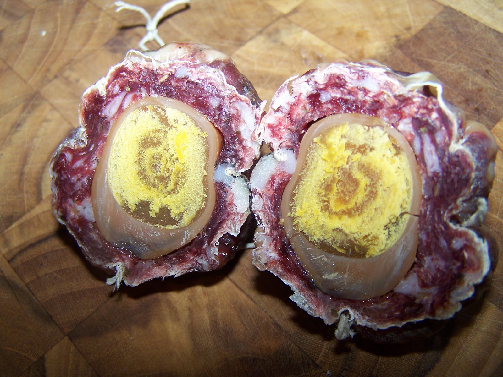 I hesitate to admit it, but sometimes I scare myself. I was rearranging the meat cave and stumbled upon a hard nubbin of salami. Has to be from around Christmas time. I wacked it open and then remembered, AH, I put a pickled egg in there. It dried along with the salami and is hard and smells quite nice. But the question remains... can I eat it? Dare I? Has anyone ever heard of such perversity? Everytime I think I've invented something new someone tells me, nope it's been done. So I'm supposing this too is nihil novum sub sole.