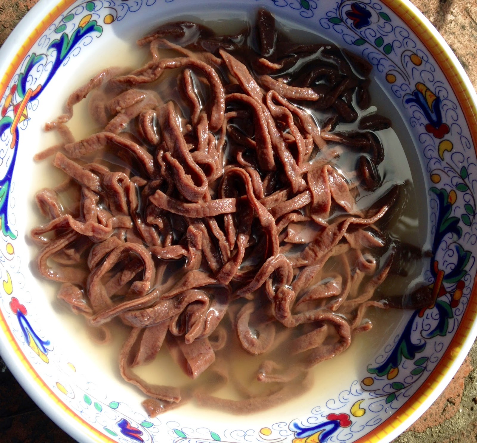 I didn't realize there really was such a thing as pig blood noodles, but I suspected there must be. Of course it's Italy, Sudtirol. Blutnudeln or Tagliatelli al Sangue. I hope you will forgive me for going completely Asian here though. It is wheat flour to hold the blood together and then in dashi stock. I then garnished it with various soba-friendly condiments like fish cake and seaweed, just to be confusing - but there not pictured here. It's good. The blood isn't as pronounced as I thought it would be. It's awfully nice though and I bet if served in a Japanese bowl no one would bat an eyelash.